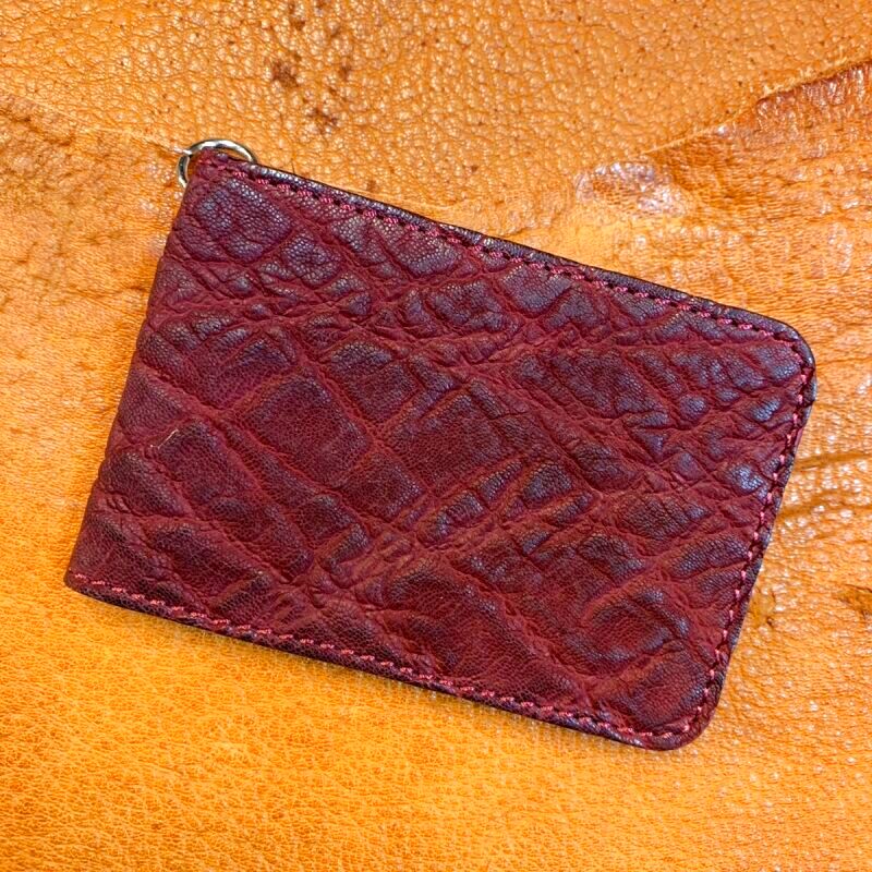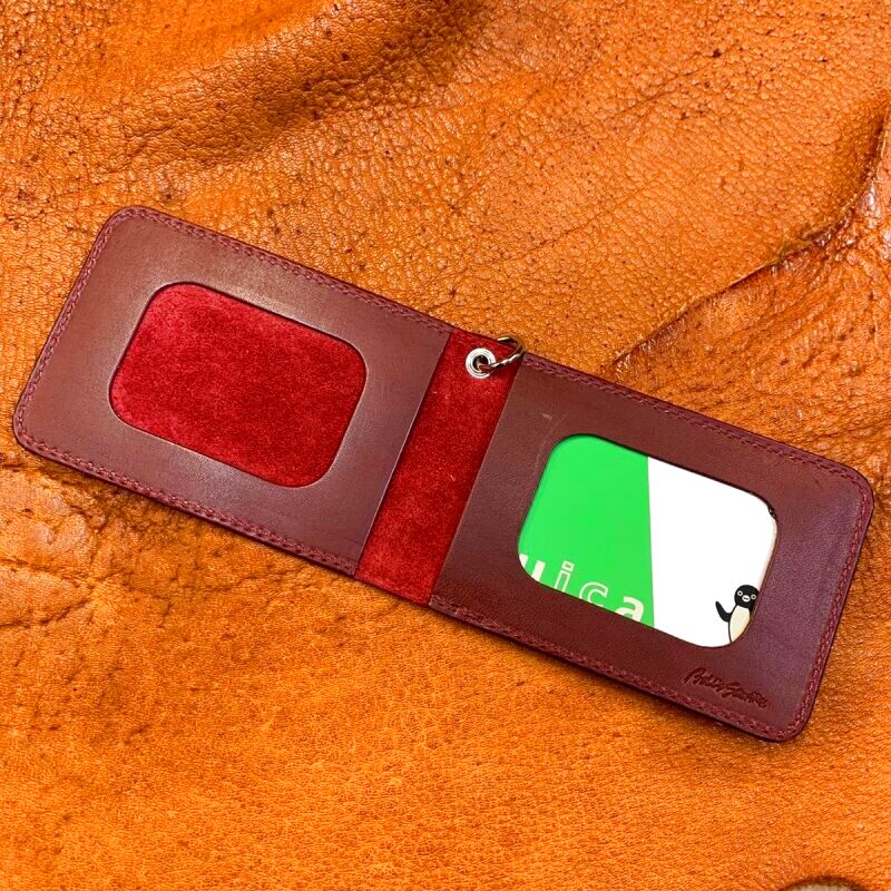 外装に象革のワインレッドを使用したパスケースです。しわの多めの場所を使用したバージョンです。裏地にはピッグスウェードを張り付けております。写真のものをお届けとなります。