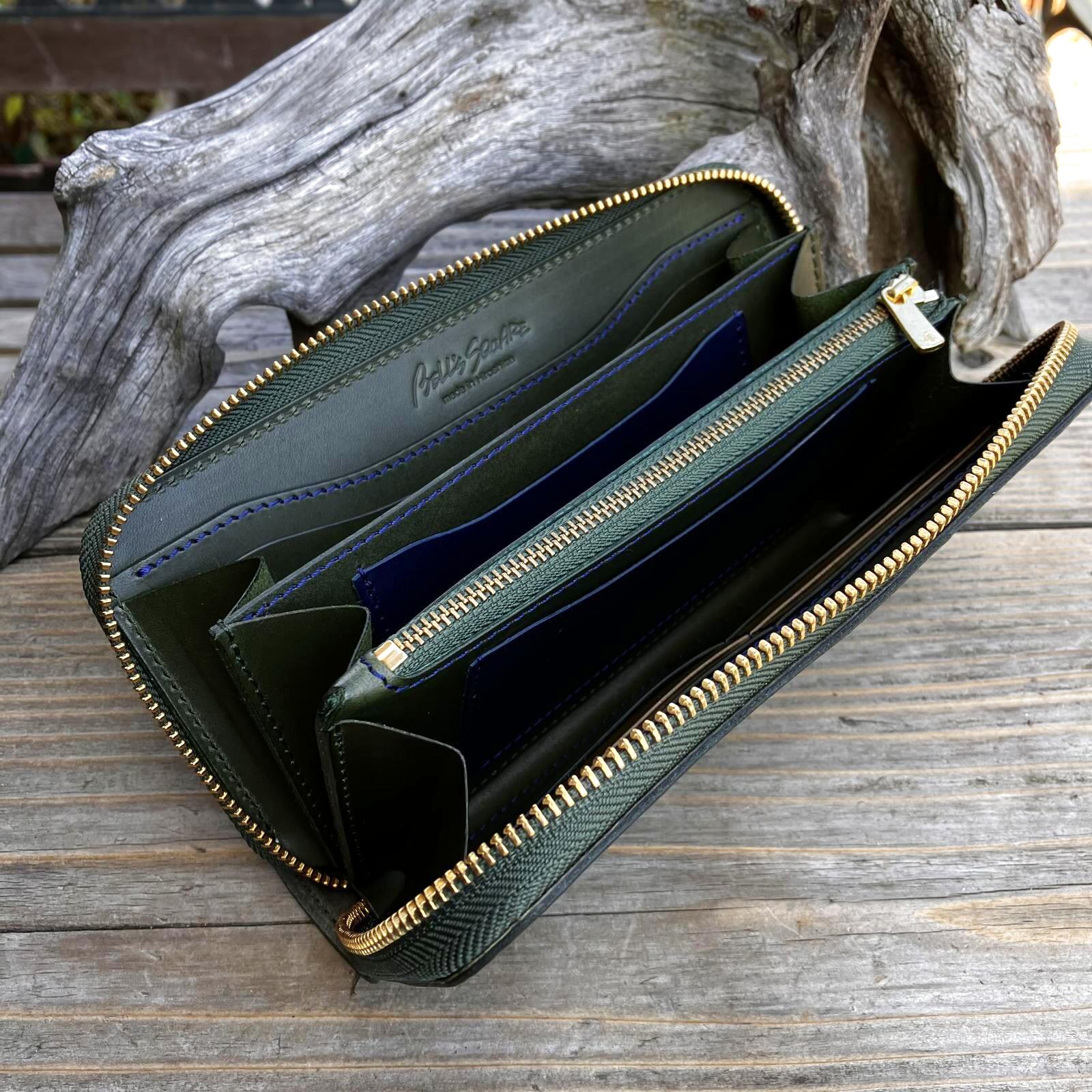 【広島ジビエレザー】限定1点即納可能★青桐翠ジビエ鹿革&牛革ラウンドファスナー長財布 青桐翠 [NO.0584]