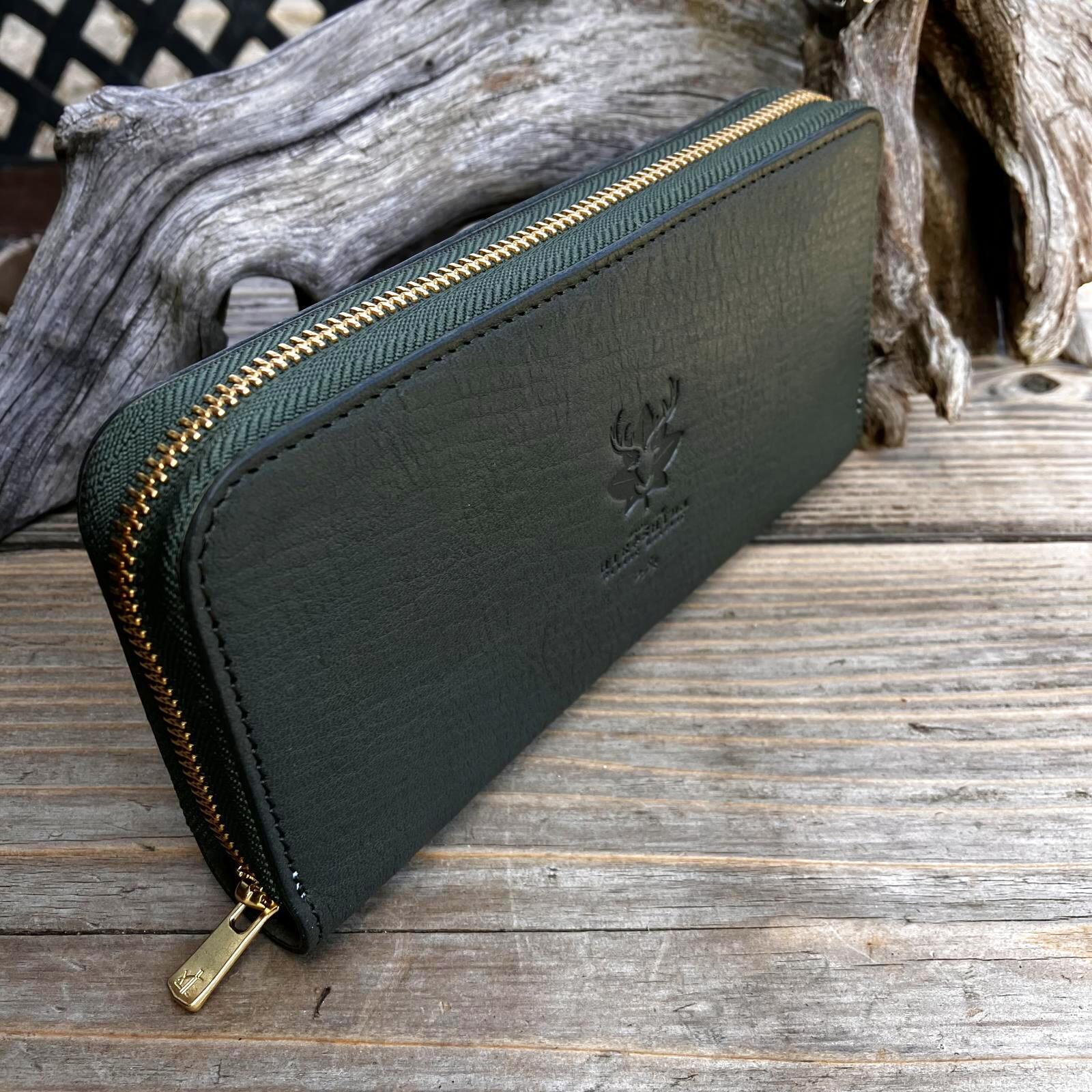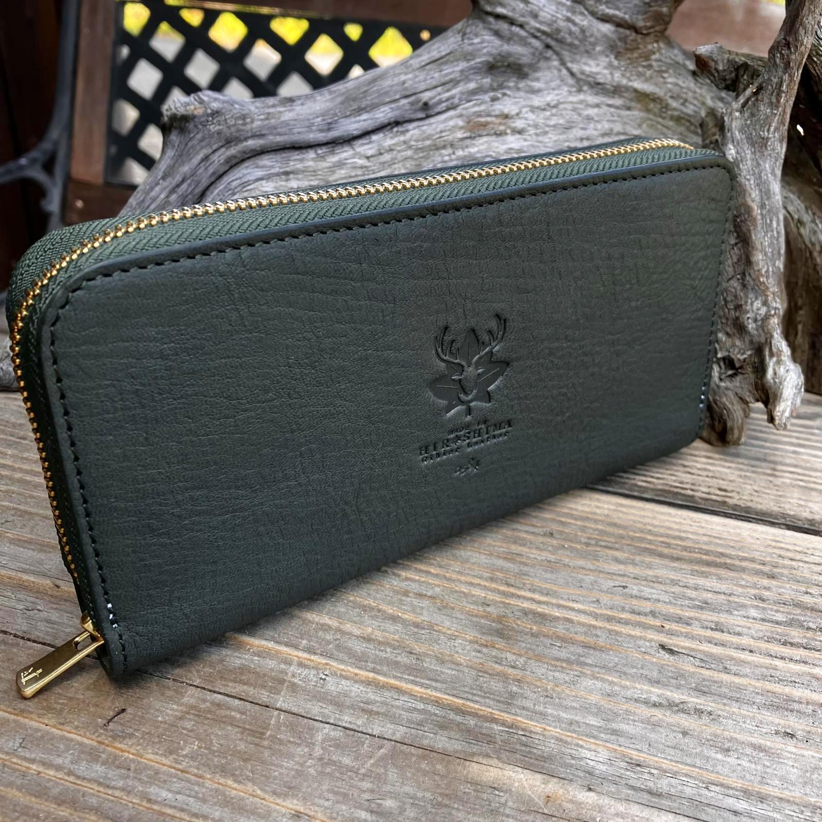 【広島ジビエレザー】限定1点即納可能★青桐翠ジビエ鹿革&牛革ラウンドファスナー長財布 青桐翠
