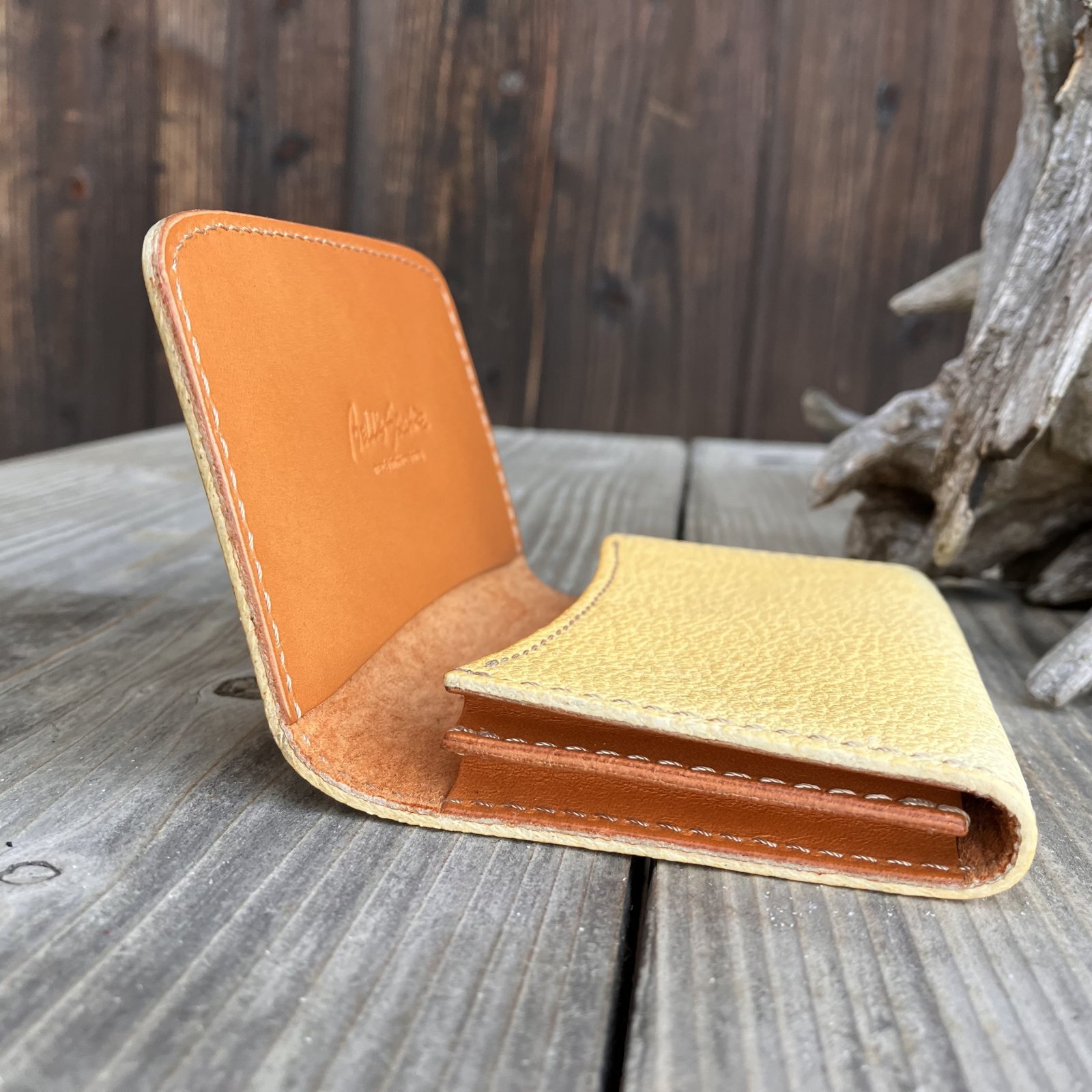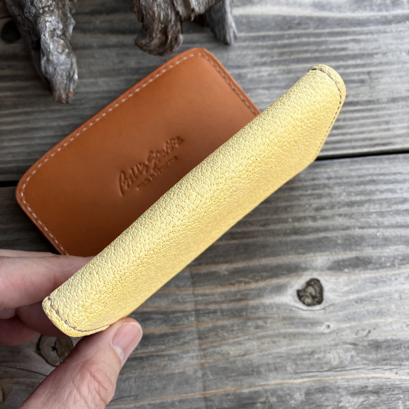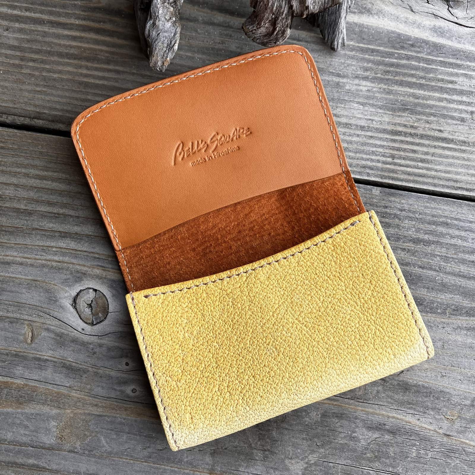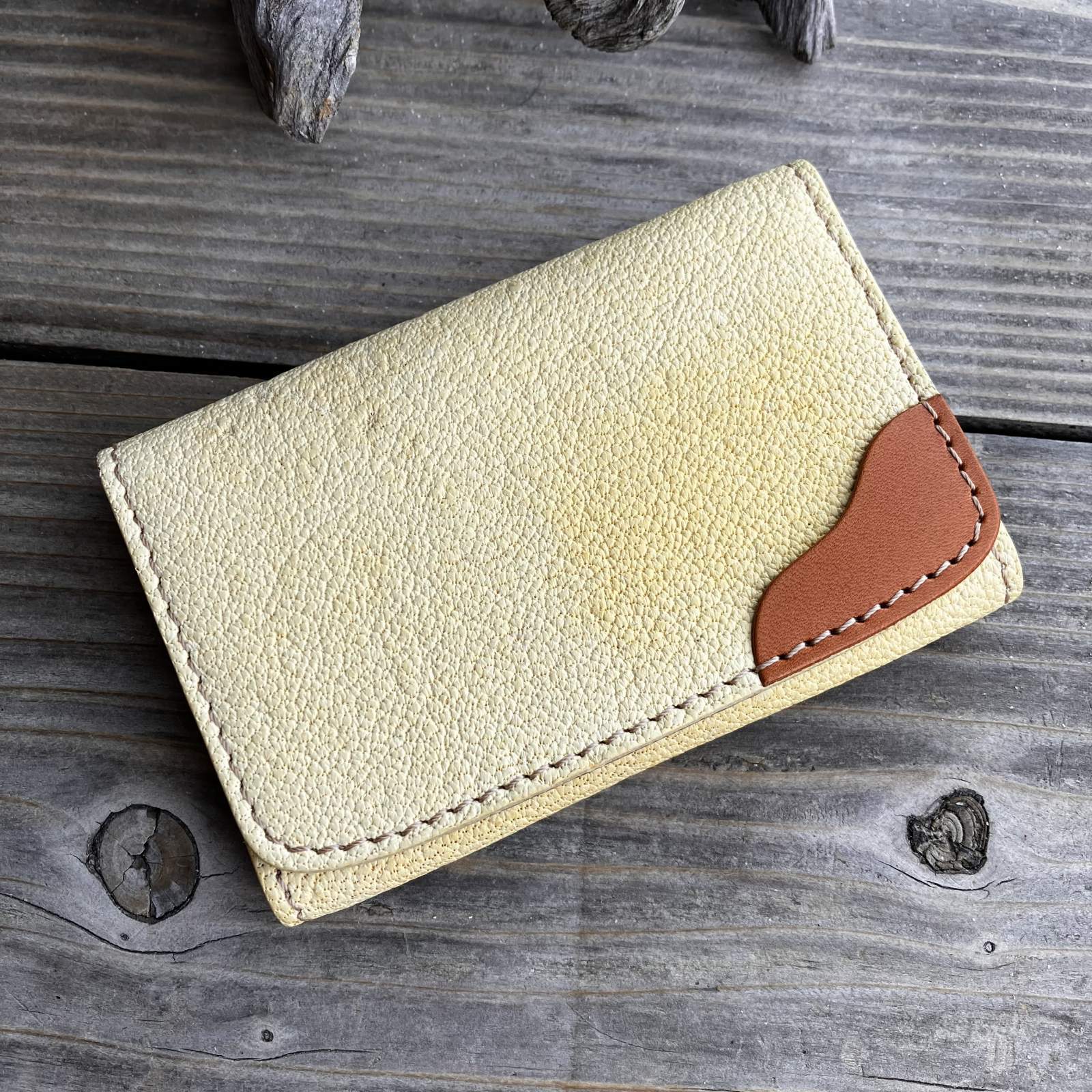 【アウトレット/ツキノワグマレザー】縁をかき集める熊手デザイン 名刺を落とさない熊革名刺入れ・カードケース(ベージュ 日焼けあり)