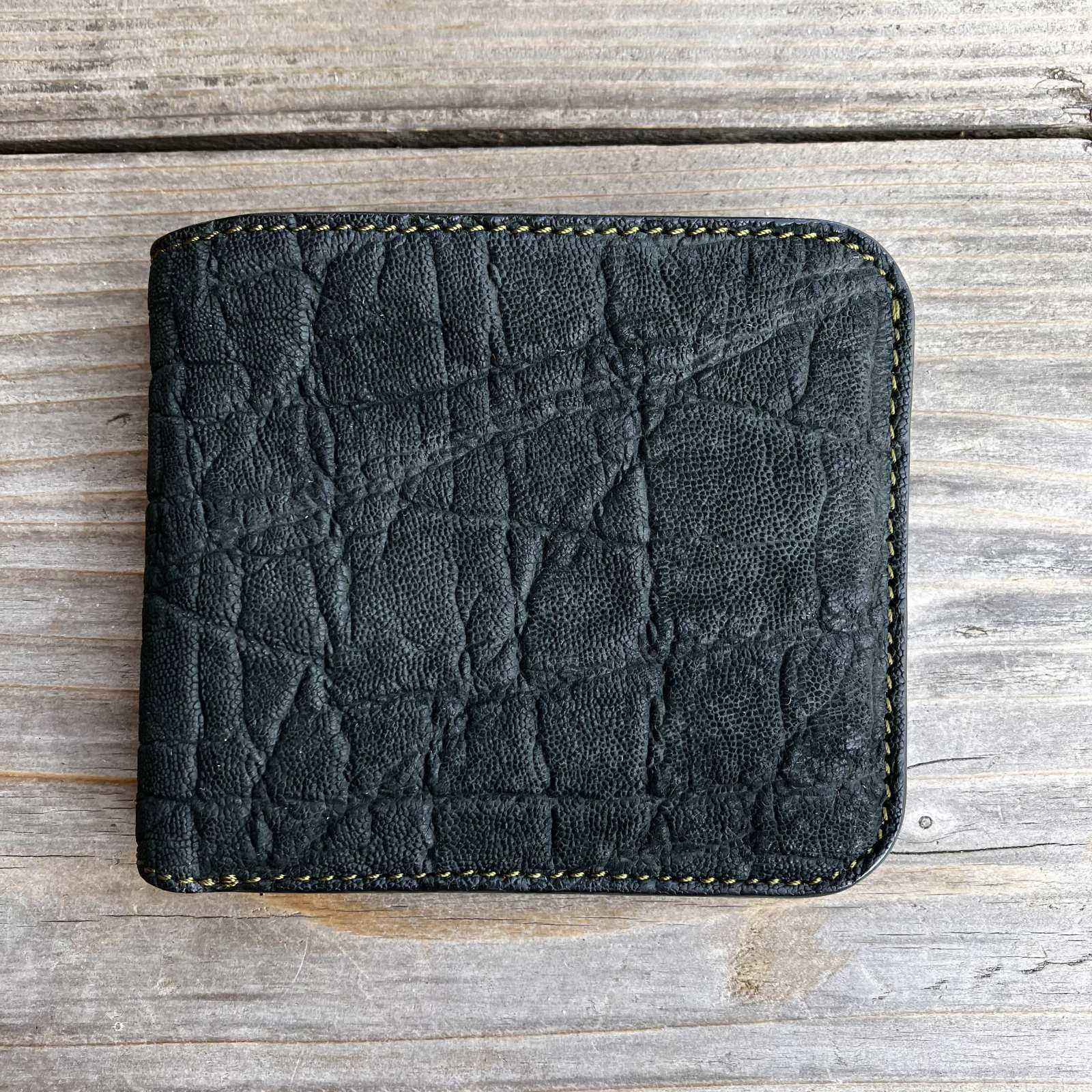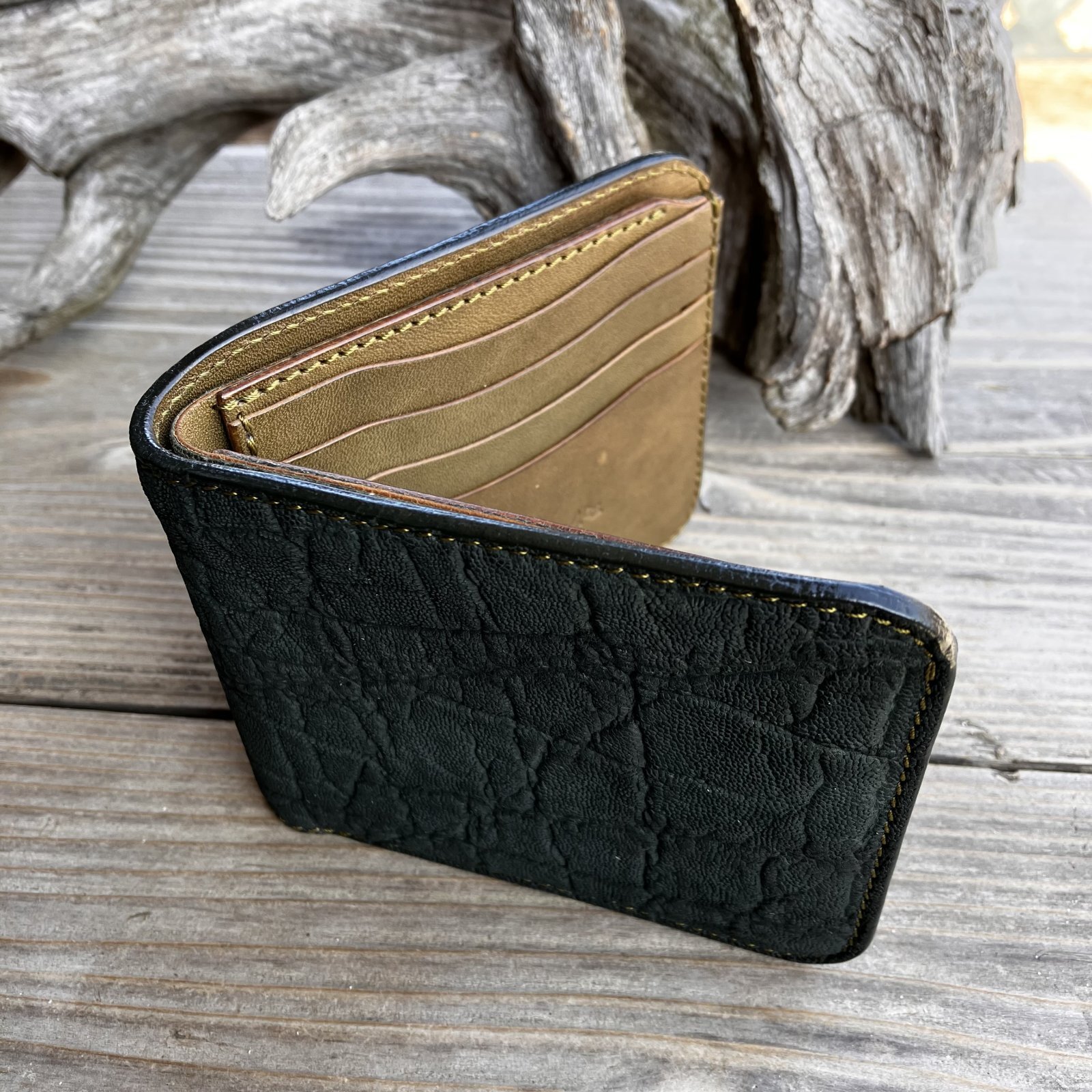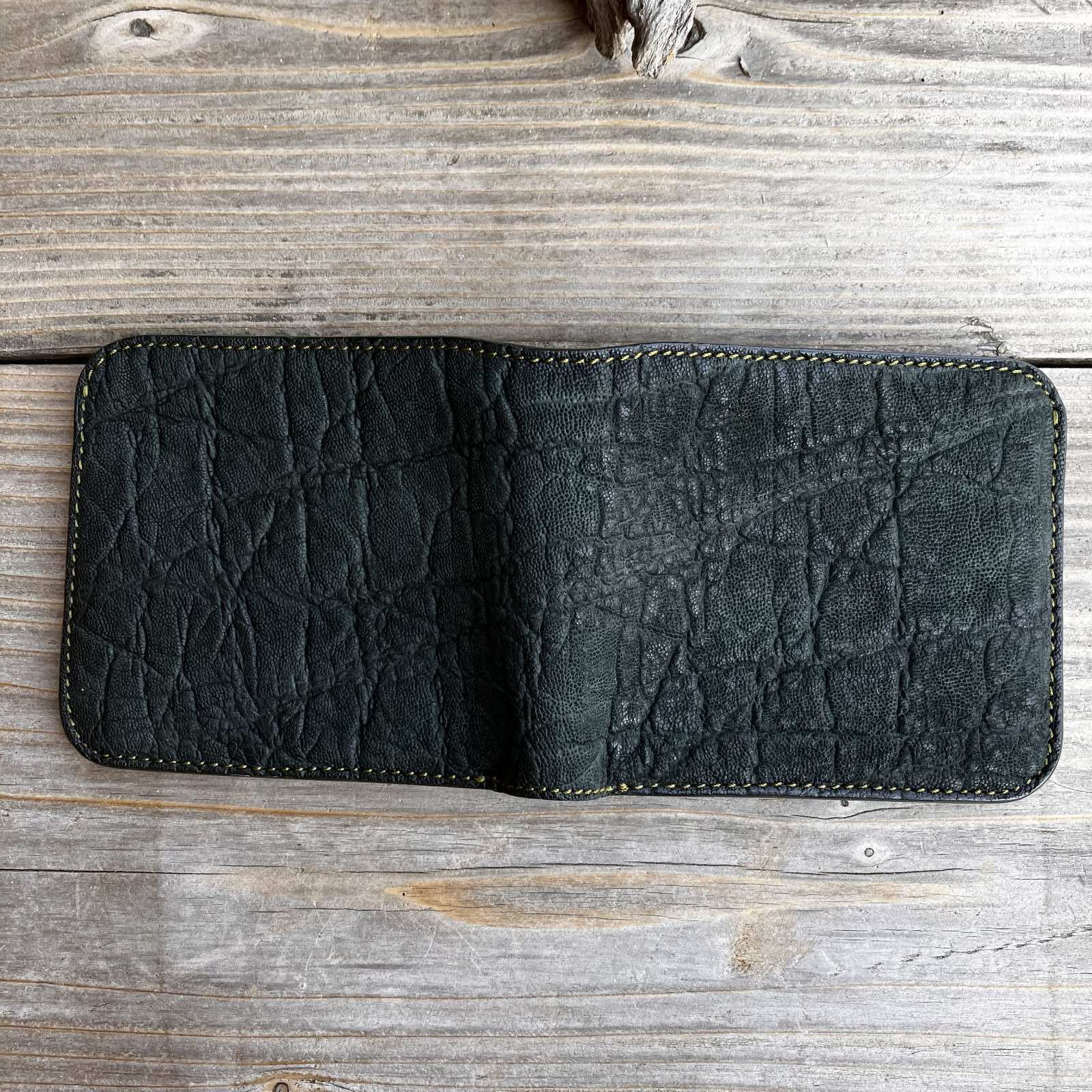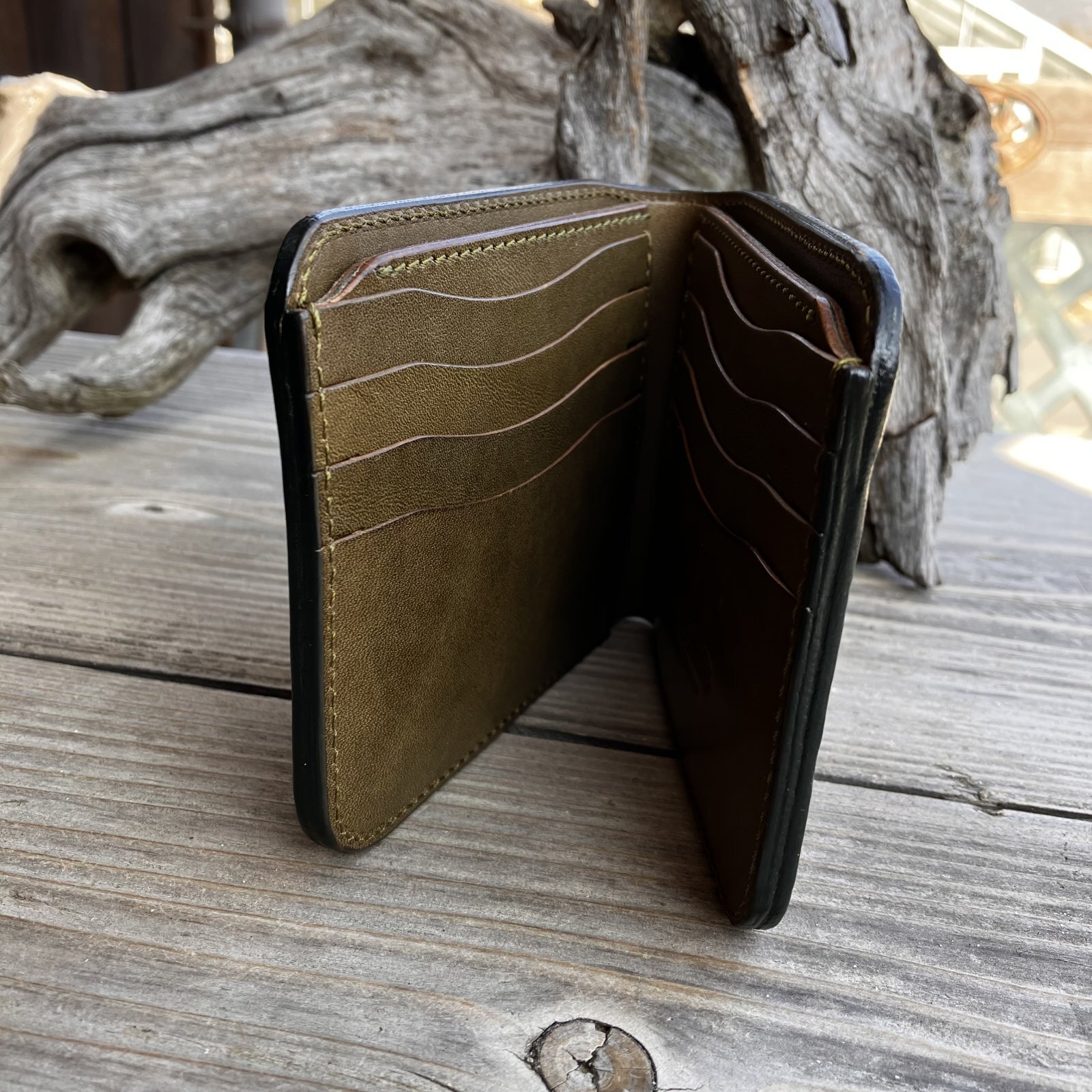 【一点限り/アウトレット】象革×姫路ヌメ革 二つ折り札入れカードケース|深緑×カーキの極上バランス