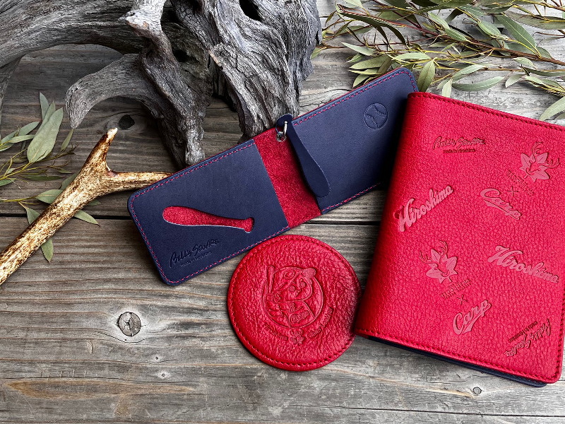 広島の山々で育まれた天然鹿革(ジビエレザー)を、マツダスタジアムの熱狂を呼び覚ます鮮烈な“カープ・レッド”に染め上げました。